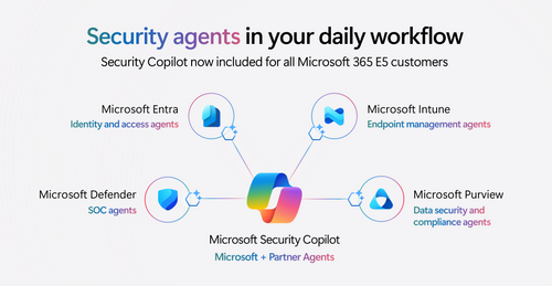 - AI-powered security agents are embedded across Defender, Entra, Intune, and Purview